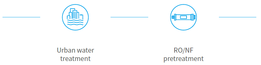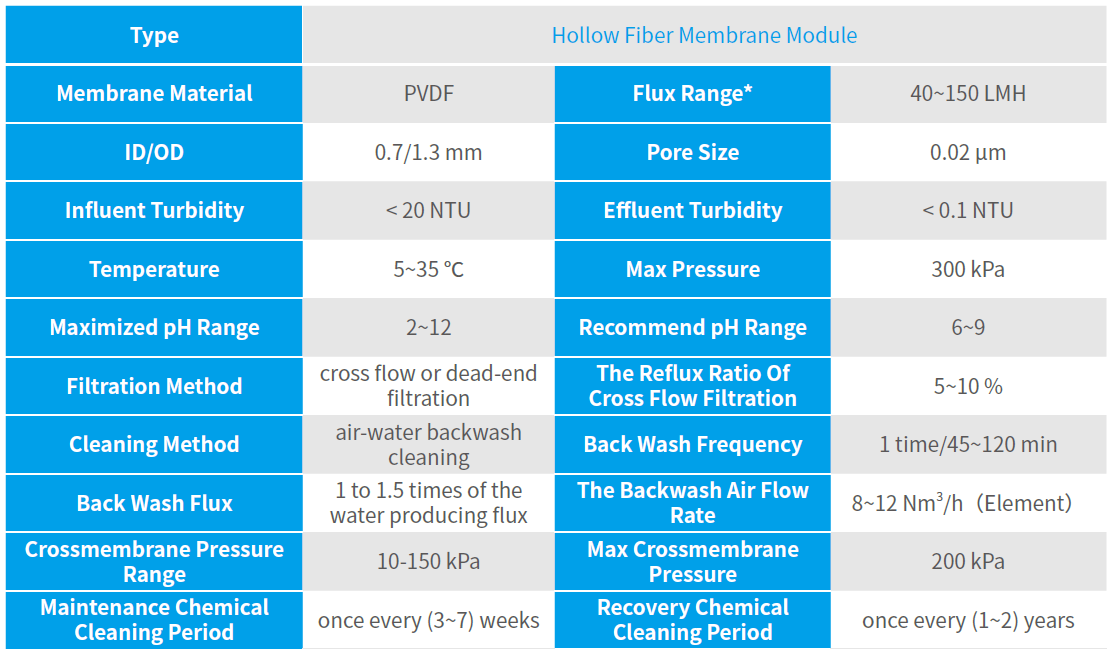 Excellent effluent quality: Narrow membrane pore size distribution, high filtration precision, more than 6log of bacterial retention rate, more than 41og of virus retention rate;