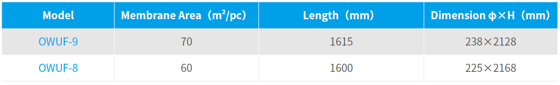 The OWUF(External Ultrafiltration Membrane Module), breaking through the design of polyvinylidene fluoride (PVDF) ultrafiltration super-hydrophilic modification and new detachable structure and eliminating membrane fouling in the application process of ultrafiltration membrane, is featured with higher seawage interception and larger filtration area. Thus, the system is ensured to run stably for a long term. The product is one of the significant achievements in Major Science and Technology Program for Water Pollution Control and Treatment during “the 12th Five-Year Plan”, and it has been awarded as the New Technology and New Product in Zhongguancun, the Beijing New Techn ology and New Product,etc.