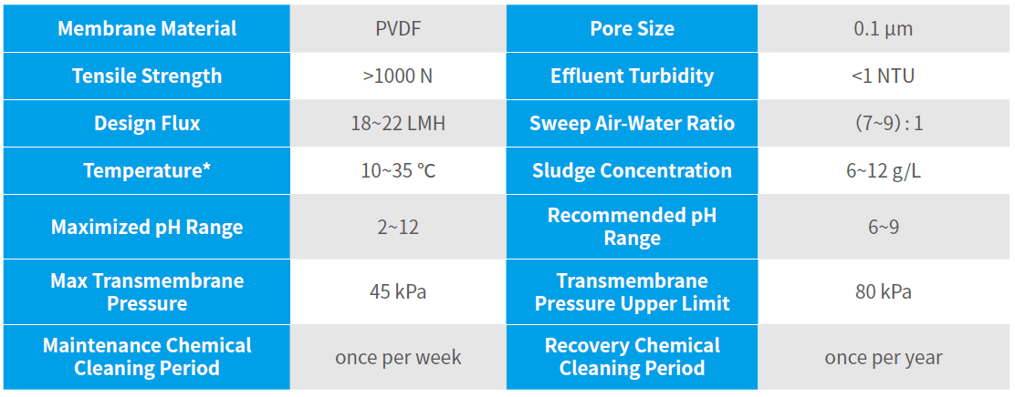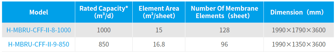 Notes: (1) *Treatment capacity with water temperature of 20℃ and sludge concentration of 8~12g/L;